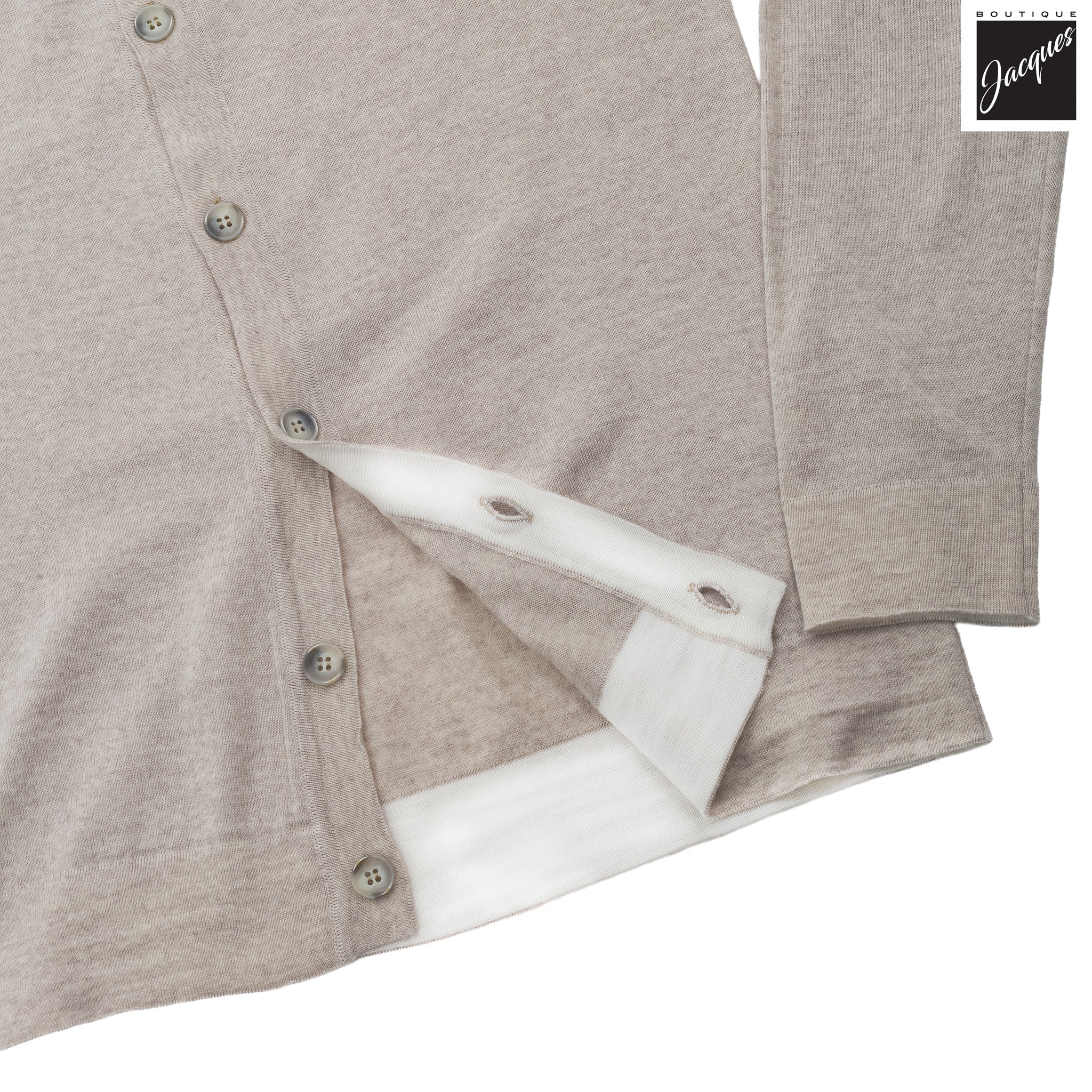 Tailored for a clean, modern fit, this long sleeve polo shirt features ribbed cuffs, collar and hemline, full button front closure, double-faced ivory fabric inside the cuffs and hemline, and stunning imitation horn buttons in light gray.