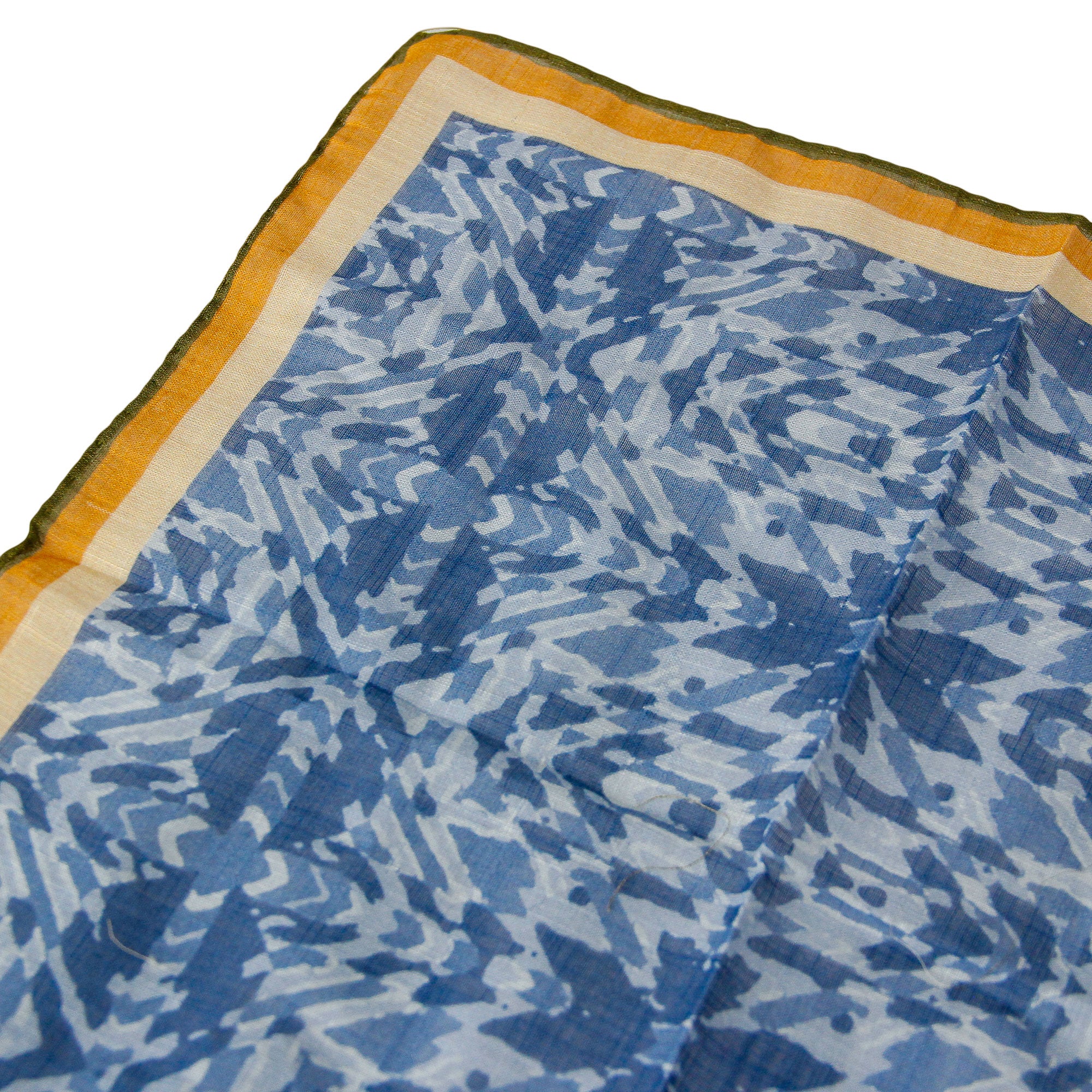 Blue pocket square made in cotton. The hankie is detailed with a geometric tribal-inspired pattern, with the sides featuring green, orange, and beige borders.