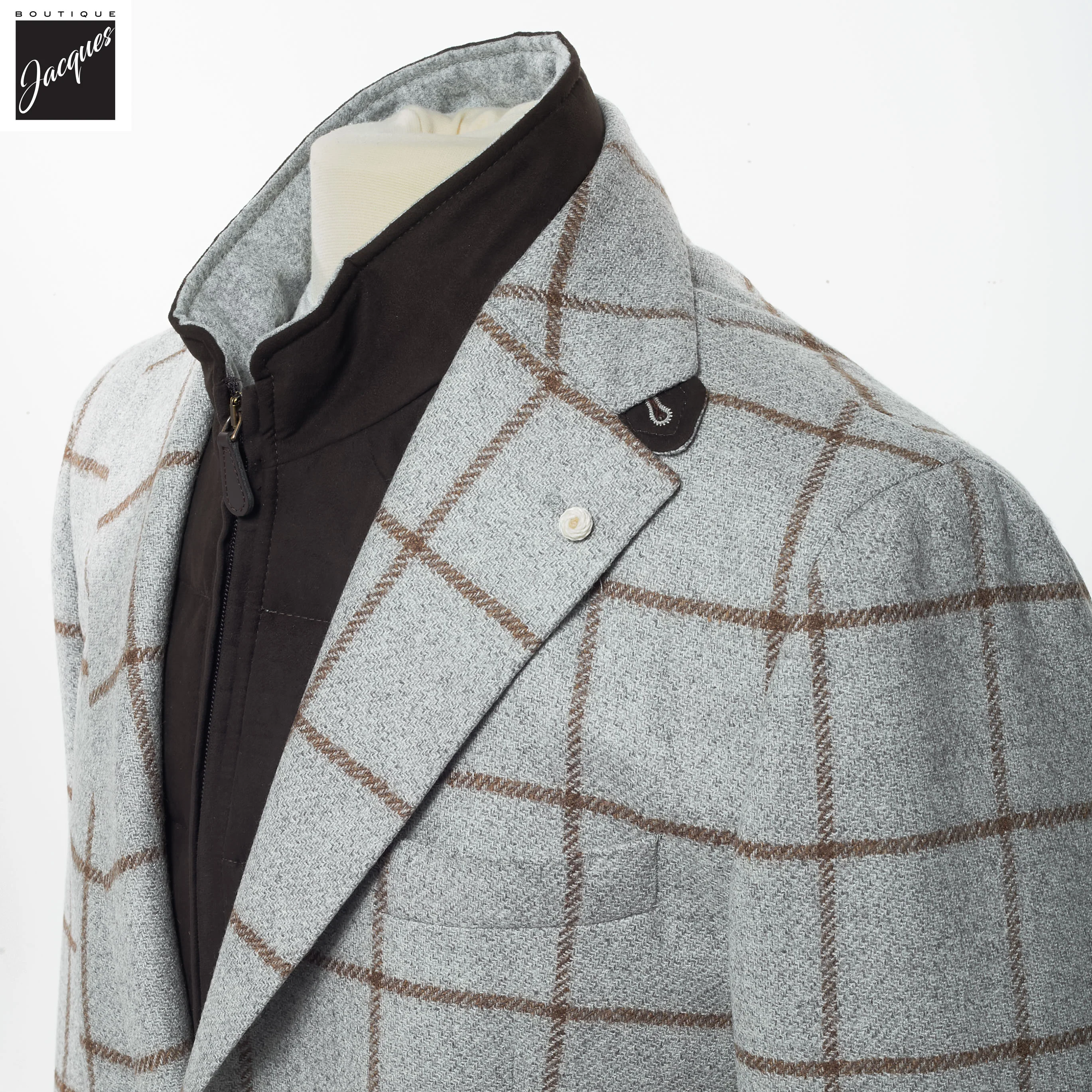 Crafted in a light gray tone with a chocolate brown windowpane check, this jacket is made from premium 100% virgin wool in a substantial yet wearable 350-gram weight, ideal for cooler months. The fabric offers a luxurious hand feel, impeccable drape, and the durability required for the demands of a dynamic professional lifestyle.
