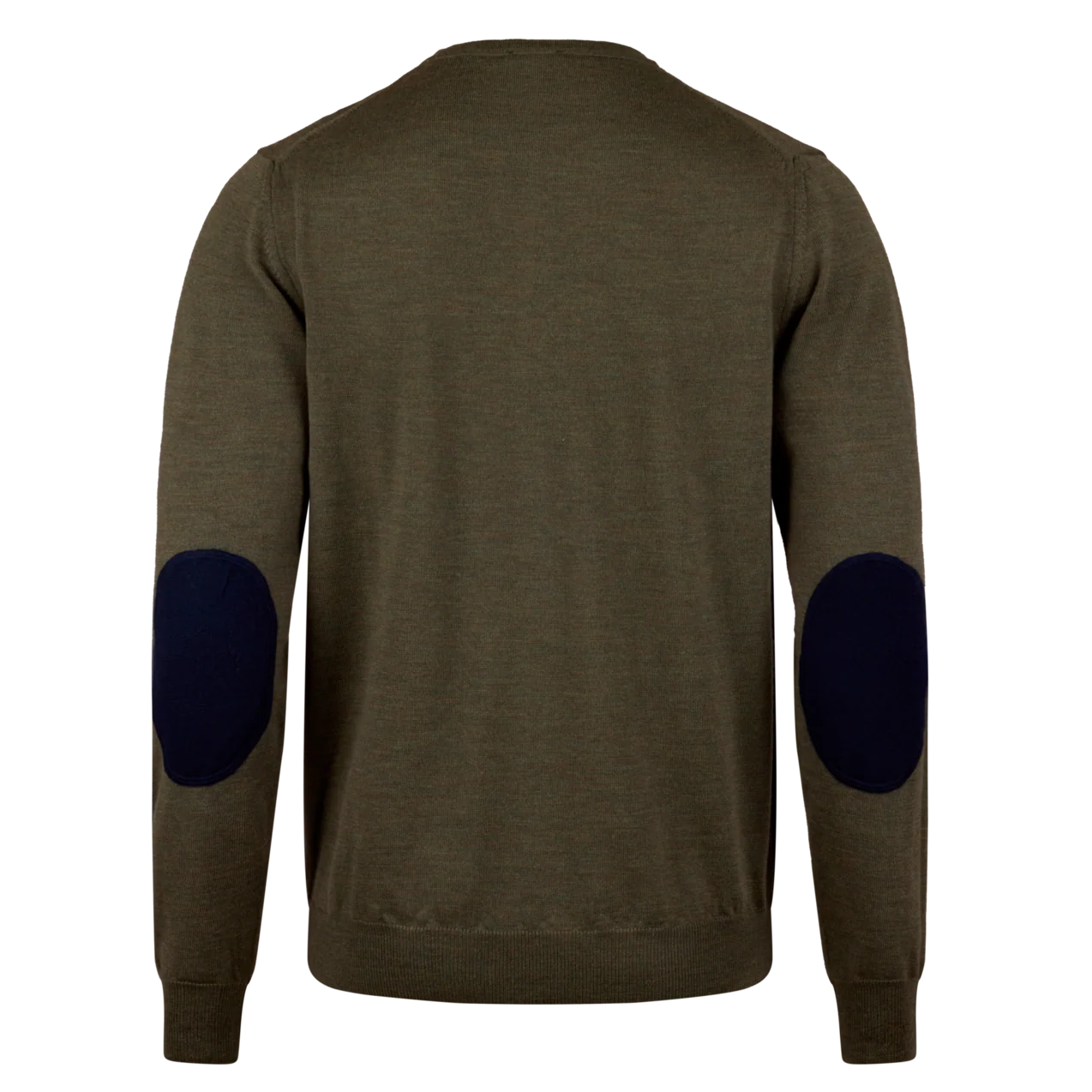 Olive Green Merino Wool Crew Neck Sweater w/ Elbow Patches - Stenströms