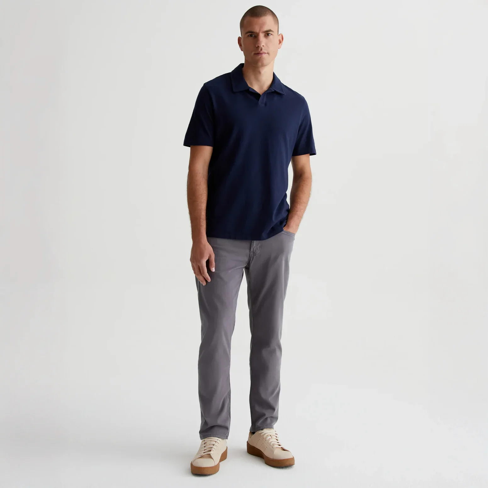 Tellis is a modern slim-fit men's pant in 8.4 oz. Sueded Stretch Sateen with a soft, clean finish. Featuring a medium gray shade, this five-pocket pair has a fitted upper block and tapered legs.