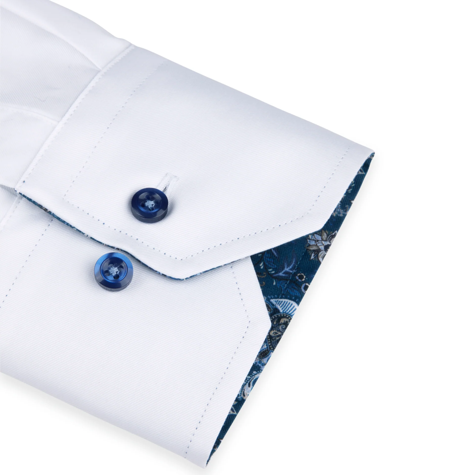 This white twill shirt is detailed with a patterned contrast fabric inside collar and cuffs. Finished with a cut-away collar, single adjustable cuffs and mother of pearl buttons. Wear it under a knitted sweater or as it is, tucked into your favourite pair of tailored pants.